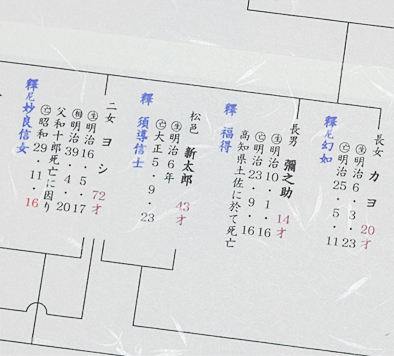 B4サイズ縦系図(B4サイズ大礼紙に上から下へ順番に代を追って、お預かりした戸籍謄本・過去帳・位牌文字写真・墓石文字写真に基づいて記載していきます)